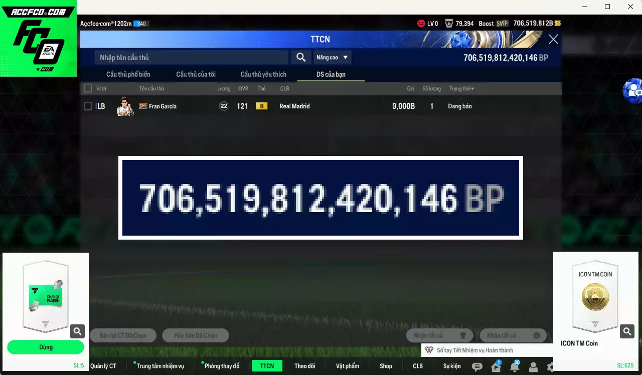 ACC FC Online chứa 706519b trắng, có thẻ đổi tên, full miniface. HLV Xịn, đã đào tạo hơn nữa bảng chiến thuật, dư 140k TC