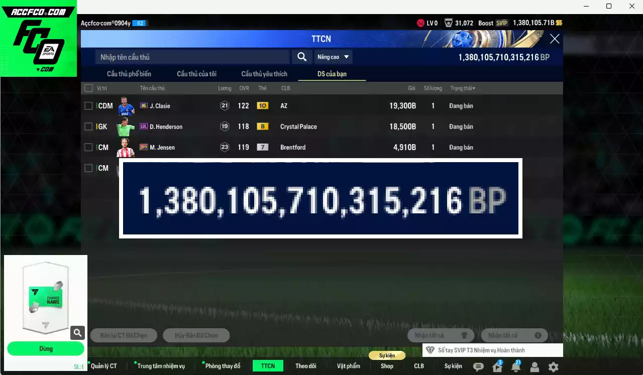 [Tặng 370FC] ACC 1380105b trắng, có thẻ đổi tên. HLV tạm, dư 140k TC
