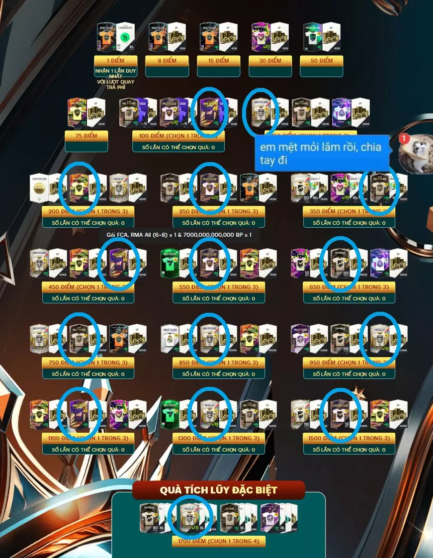 : Ngoài lần đầu tiên xả mùa UT+8 ra thì chả có đặc sắc, riêng BP trắng chỉ 530kb còn quà mốc thì cũng ko khá hơn TCSS hiện tại, nhưng ae mở toàn min vẫn trên 850kb, đừng nên chọn gói UT+8 vì là lần đầu tiên xả thì rất dễ min, nhiều con ngon như Neymar, Ramos, Varane... thì đã limit.