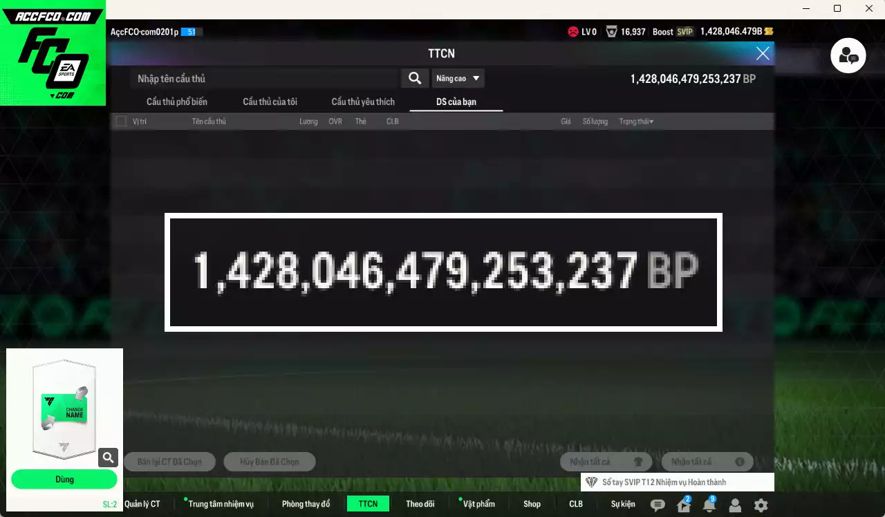 ACC FC Online chứa 1428046b trắng, có thẻ đổi tên