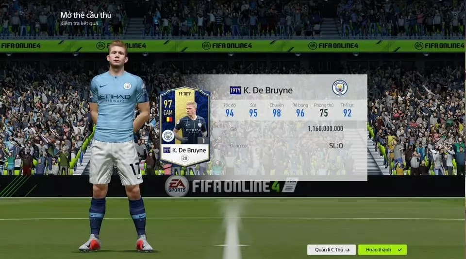 Nhìn tấm ảnh K. De Bruyne 19TOTY chỉ số 97 này, có anh em nào bỗng thấy "sống mũi cay cay" không? Dân chơi FC Online (hay FO4 ngày trước) đời đầu chắc chắn không bao giờ quên được cái thời mà để kiếm được một cái thẻ TOTY+1 nó khó và tốn kém tới mức nào. Đó không chỉ là một cầu thủ, đó là biểu tượng của sự đẳng cấp và may mắn tột độ!